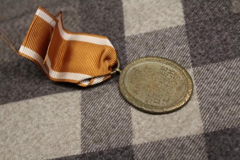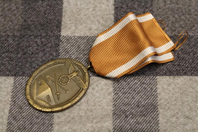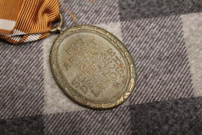 The West Wall Medal (German: Deutsches Schutzwall-Ehrenzeichen) was a decoration of Nazi Germany. It was instituted on 2 August 1939 and was given to those who designed and built the fortifications on Germany's western borders, known as the Westwall or, in English, the Siegfried Line, between 15 June 1938 to 31 March 1939.1 On 13 November 1939 eligibility was extended to include servicemen of the Wehrmacht who served on the Westwall for at least ten weeks. In all 622,064 medals were awarded until 31 January 1941, when awards of the medal ceased.