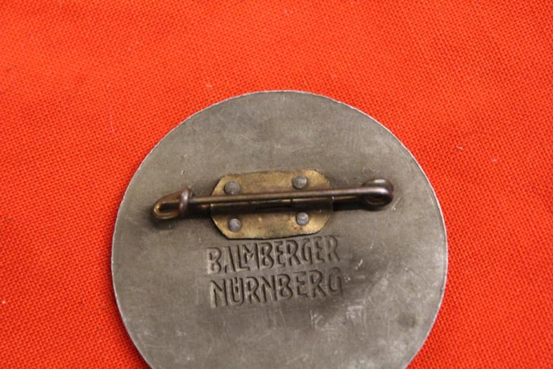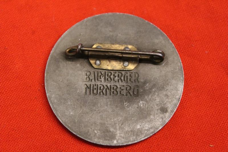 Original in good condition for age with traces of age. 1936 Party Day Badge. Maker marked: Balmberger Numberg. Good heavy solid construction.